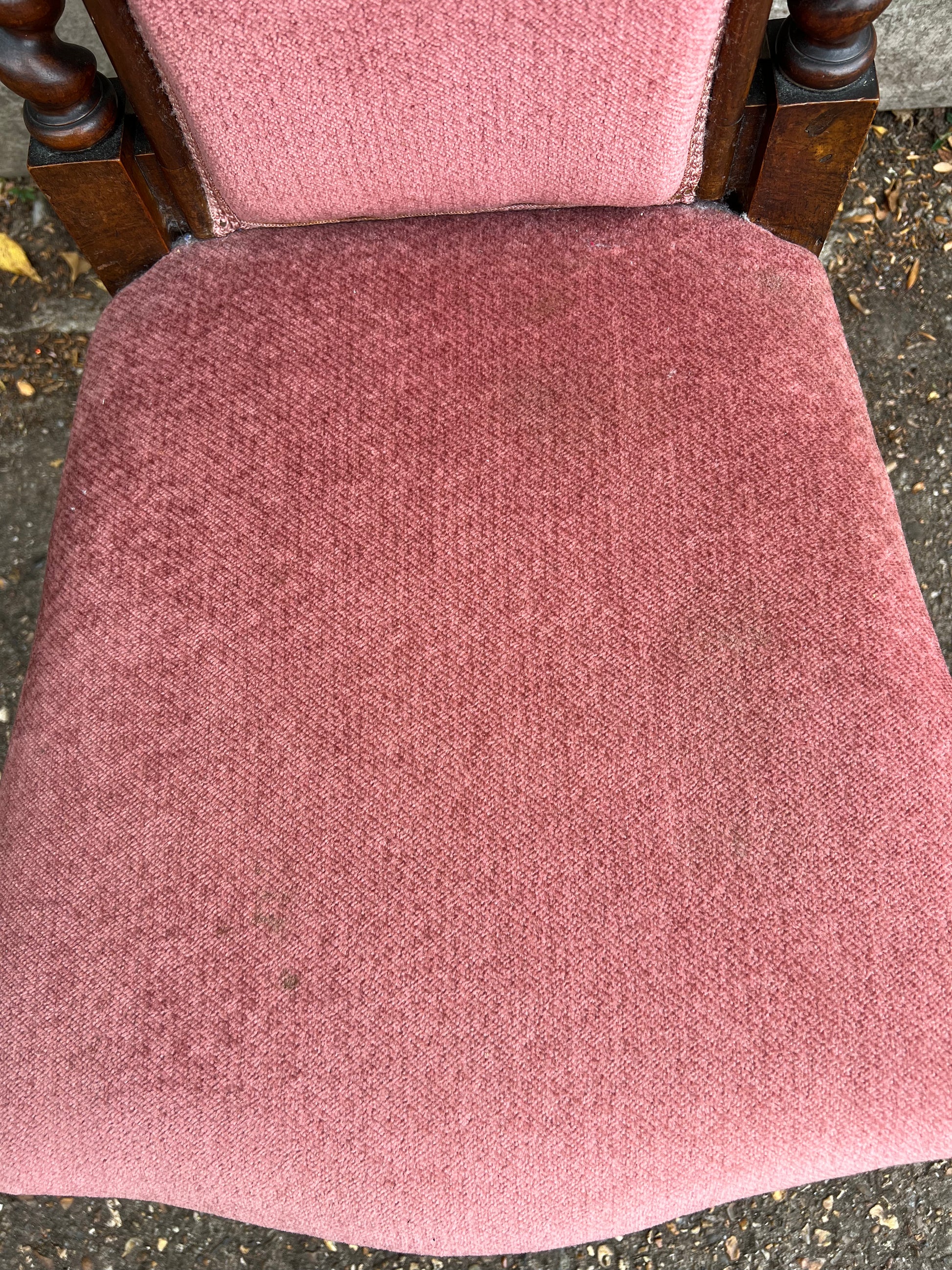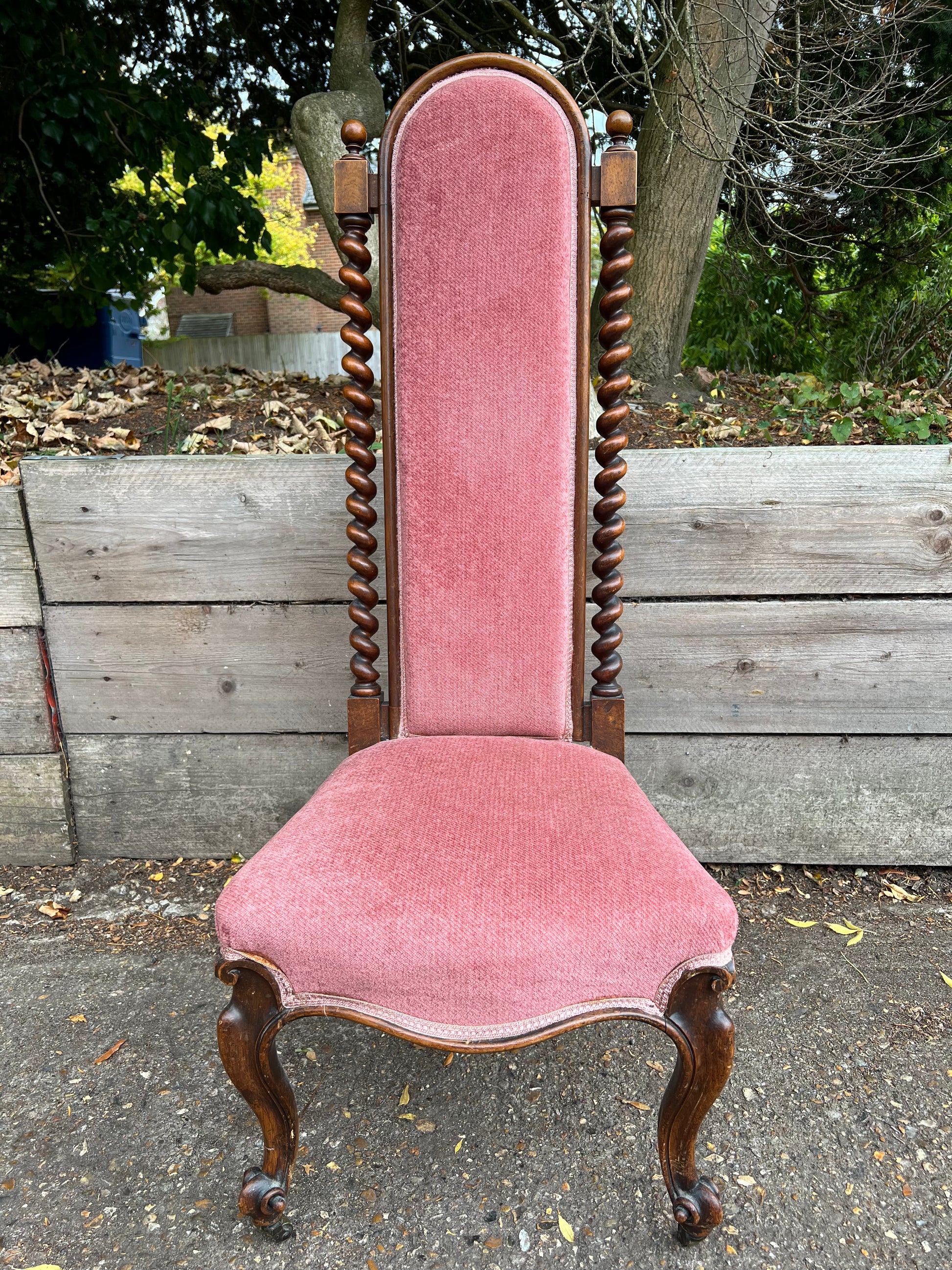 Antique Mahogany High Back Chair Barley Twist Details Upholstered In Pink