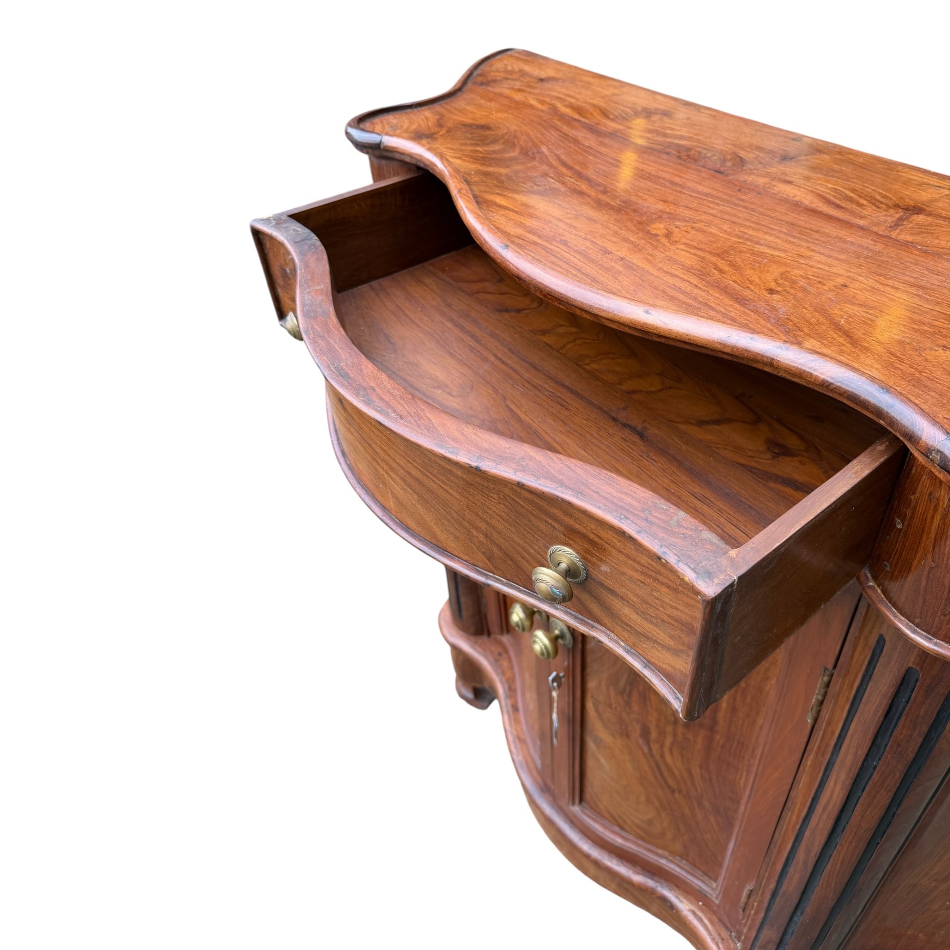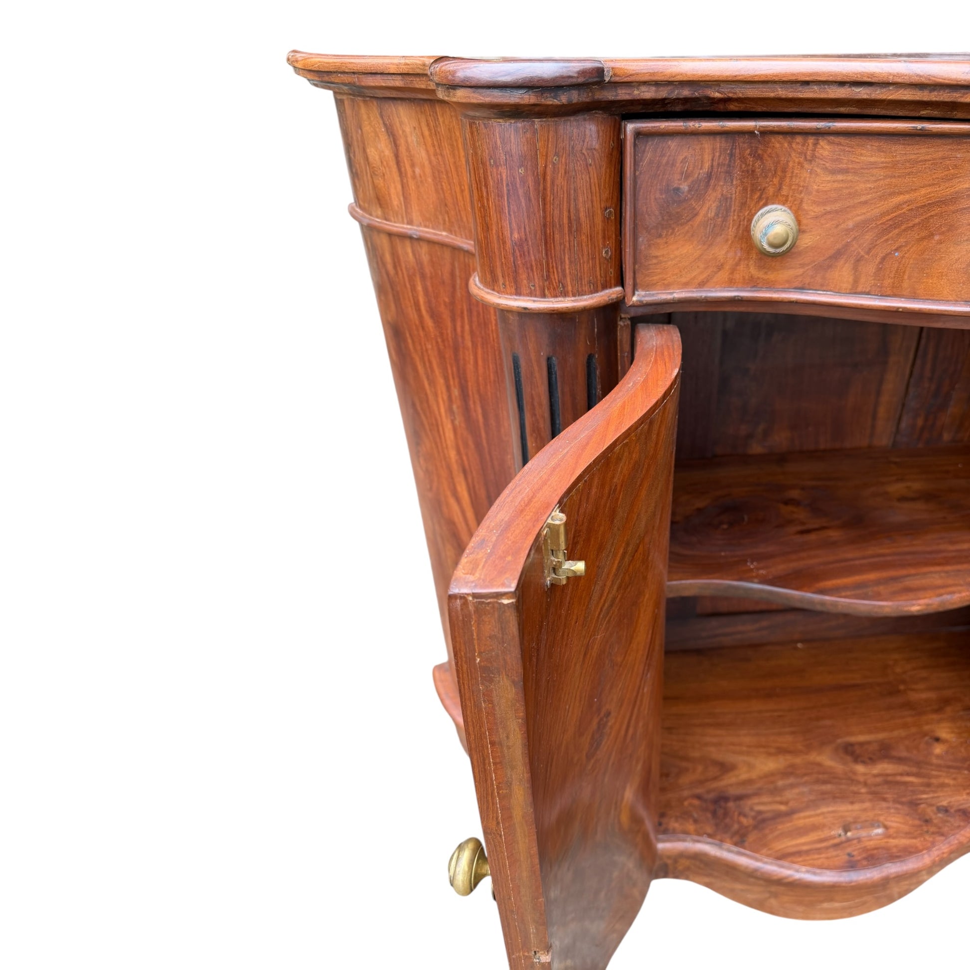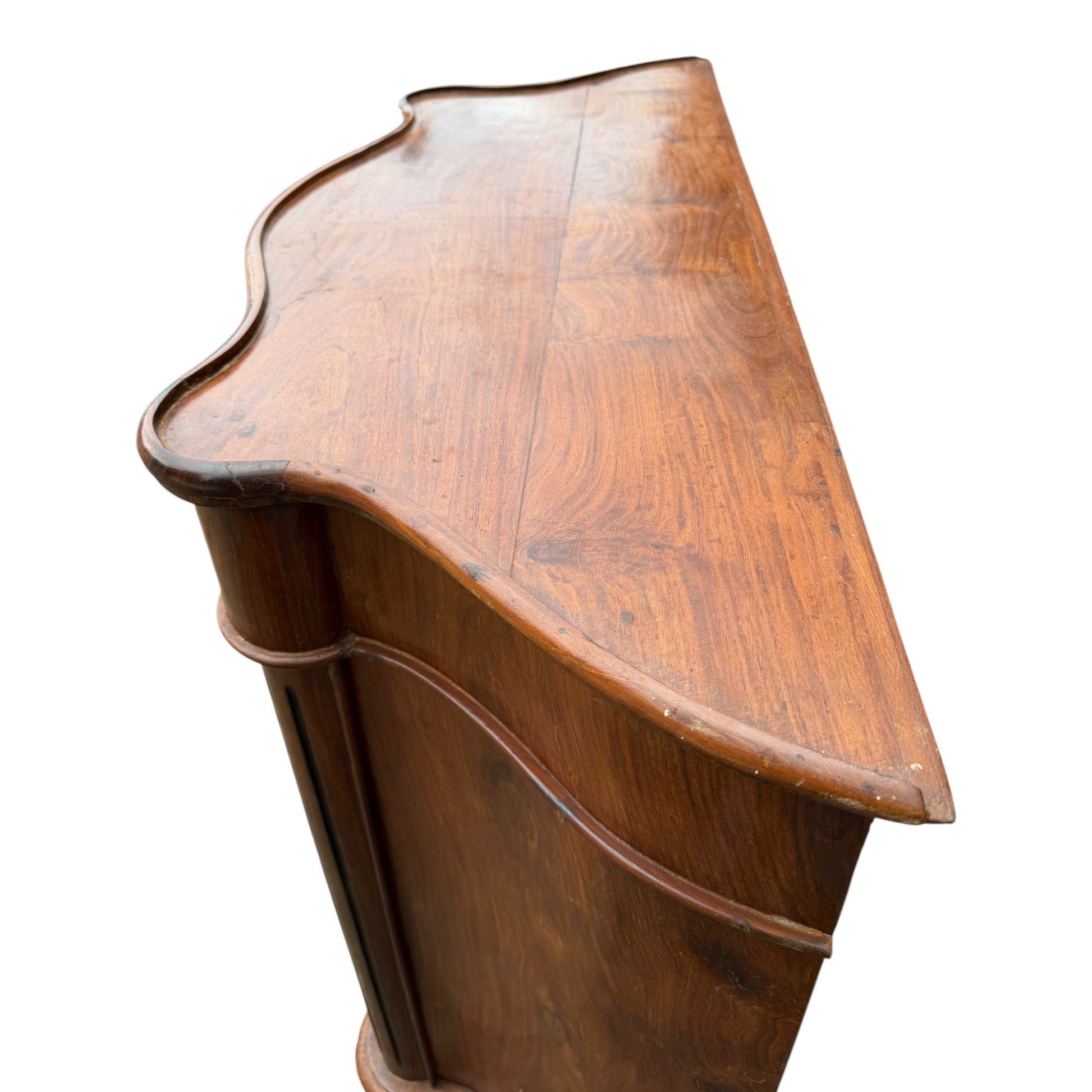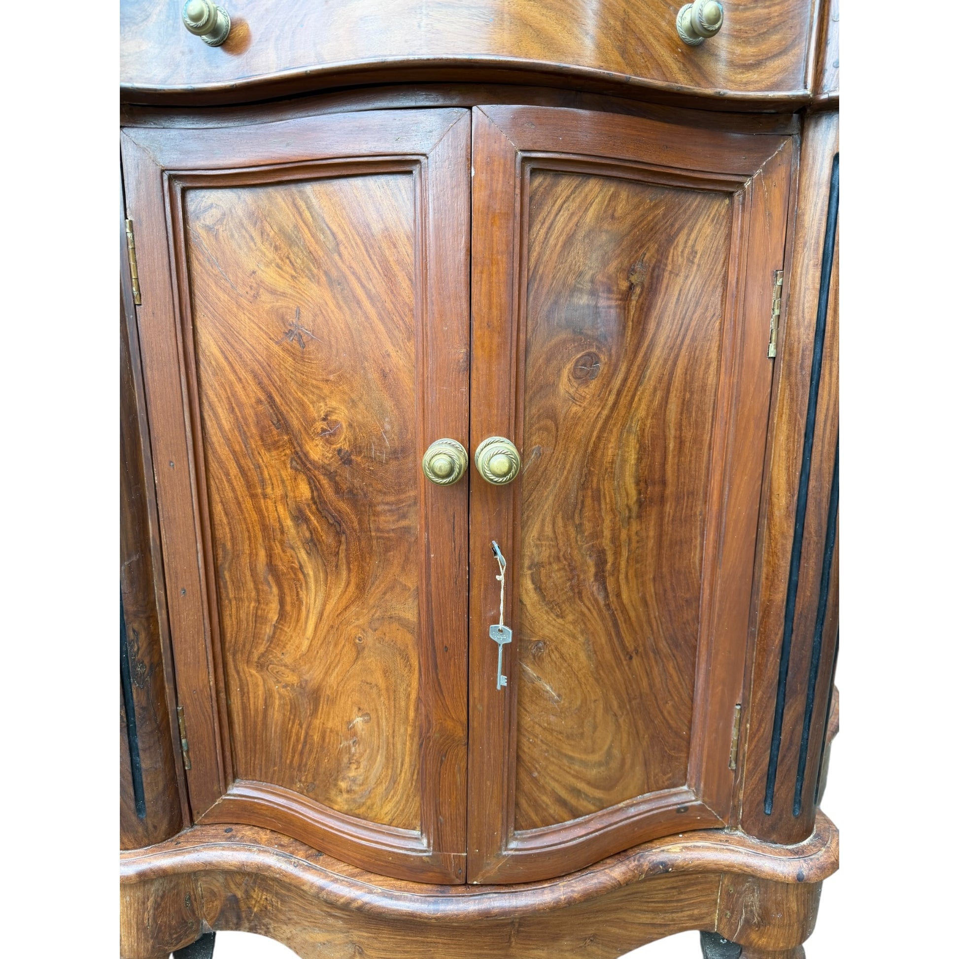 A very heavy and well-constructed solid Indian hardwood cabinet, likely late 20th century. Crafted from richly grained timber (sheesham/rosewood type), this piece features beautiful flowing grain patterns throughout, particularly to the doors and shaped top.