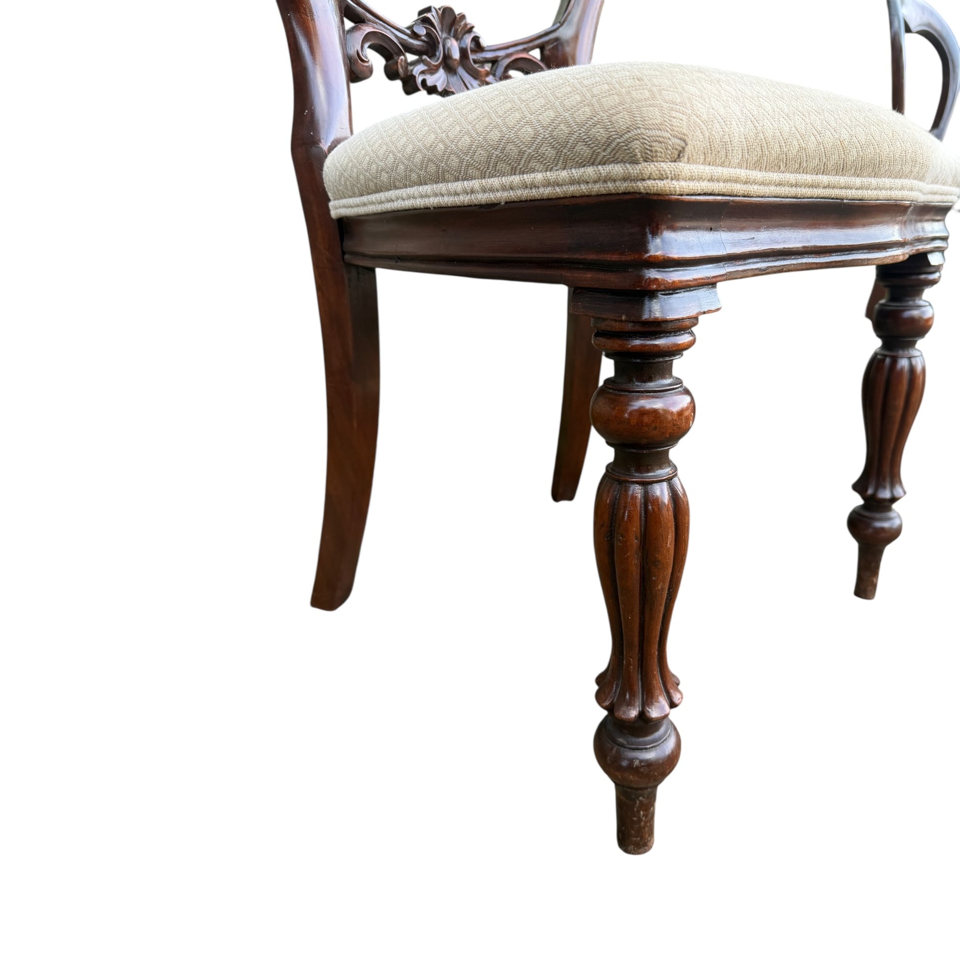 The chairs stand on turned and fluted front legs with shaped rear legs, providing a traditional silhouette typical of Victorian-inspired dining furniture.