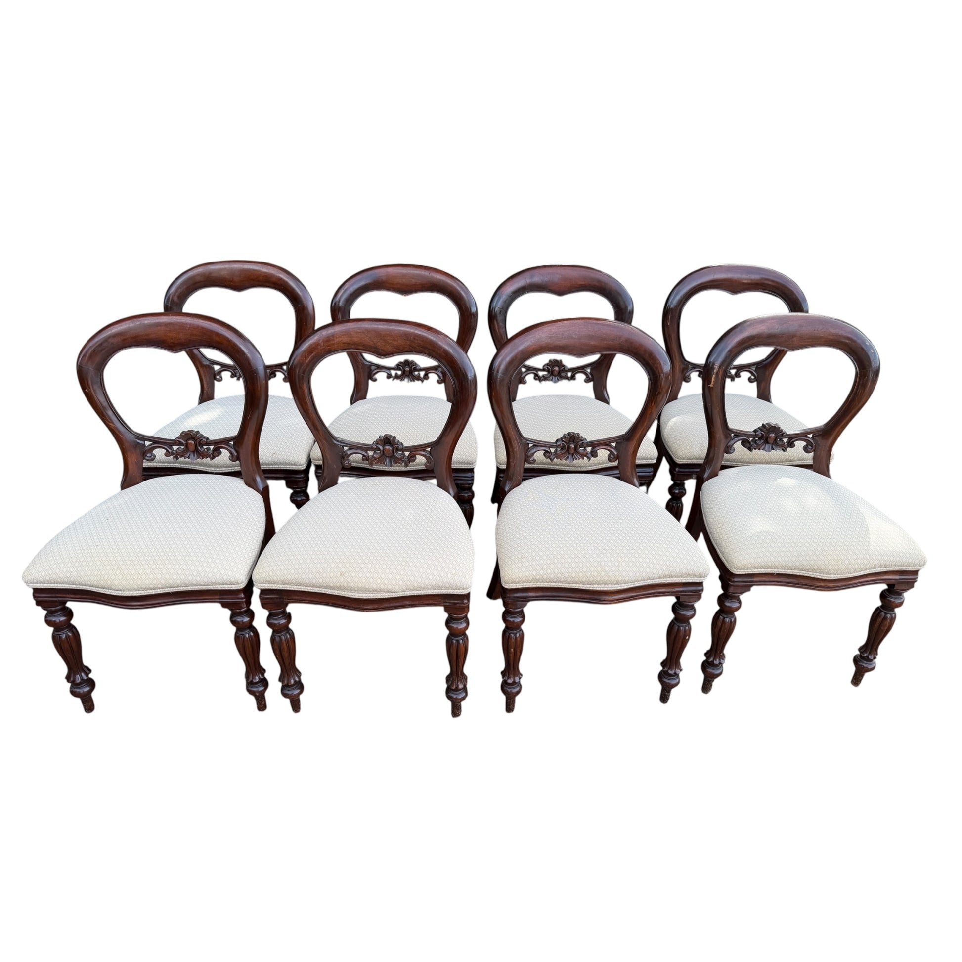 A beautiful set of eight vintage mahogany dining chairs, designed in the classic Victorian revival balloon-back style, featuring elegant curved backs, carved detailing and turned legs.
