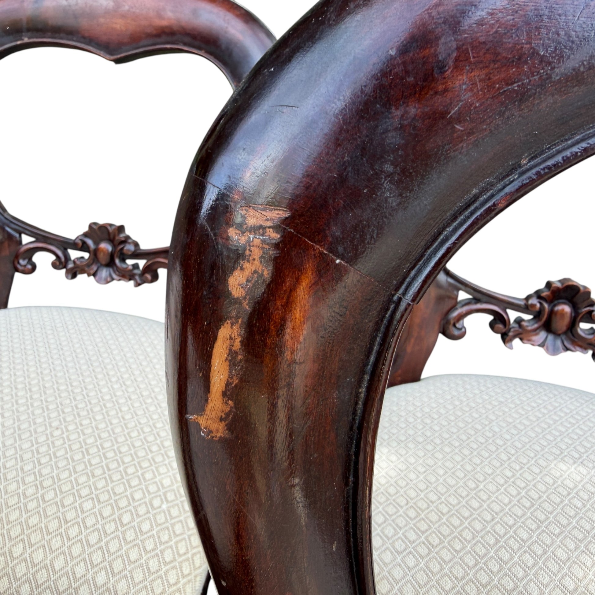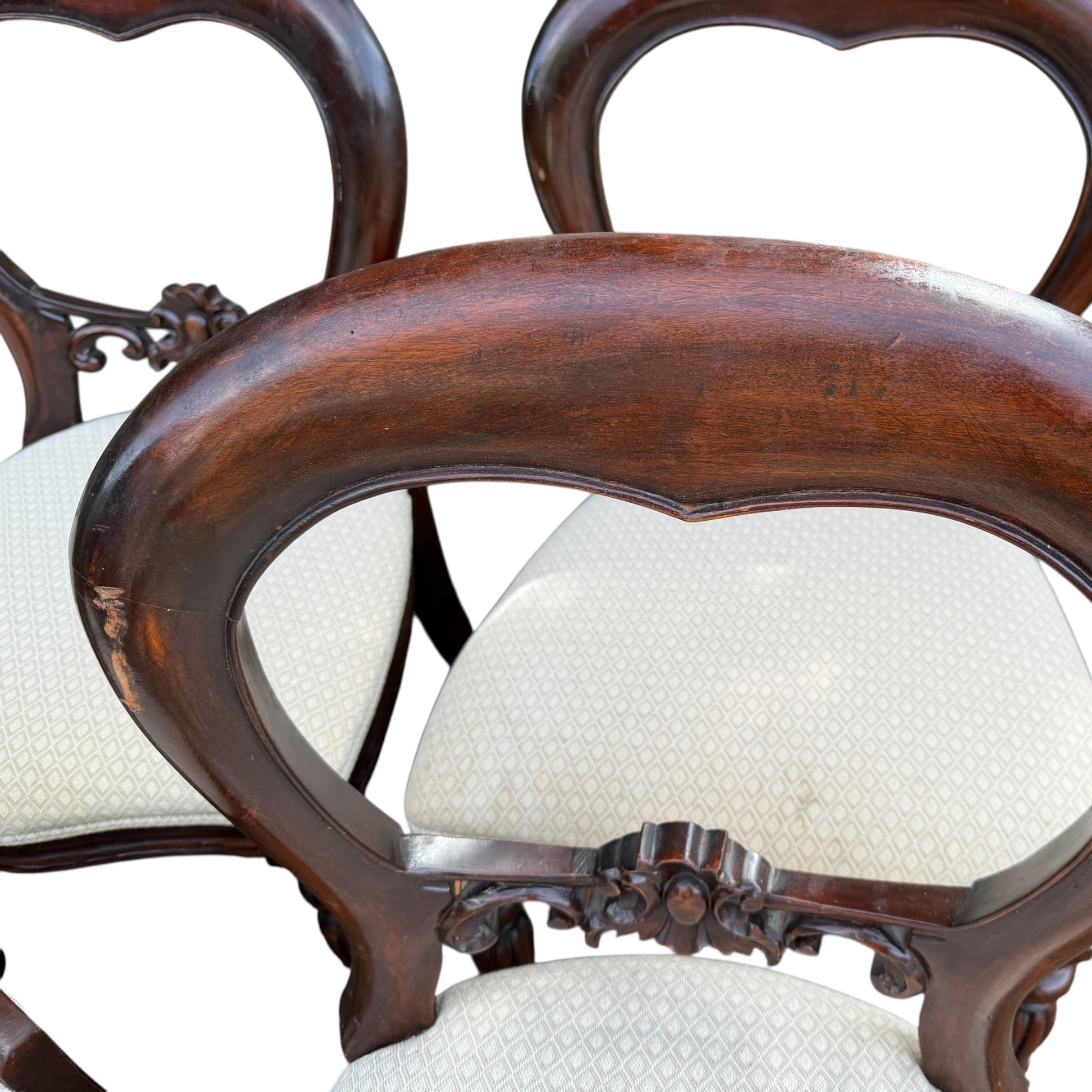 Each chair has a distinctive balloon shaped backrest with a central carved floral motif and scrolling detail, giving the set a refined decorative look. The frames are finished in a rich dark mahogany tone, which contrasts nicely with the neutral upholstered seats.